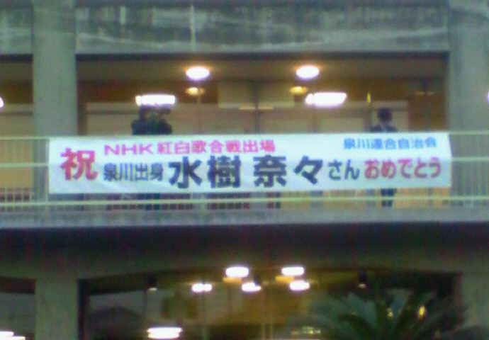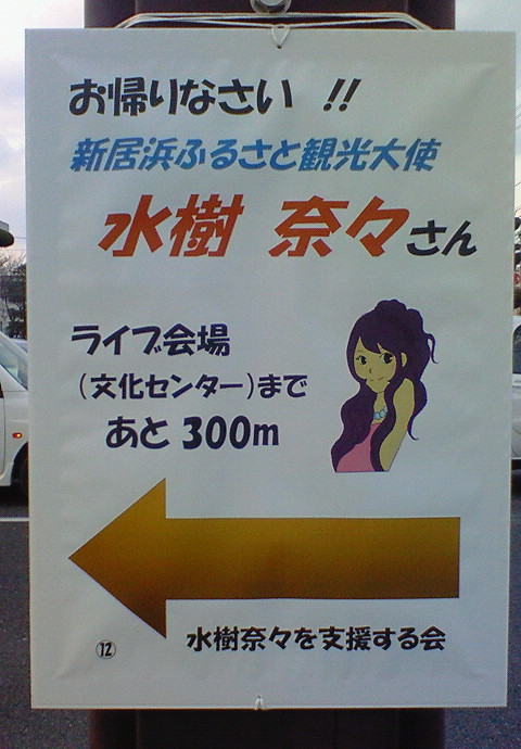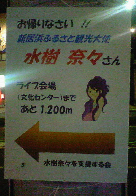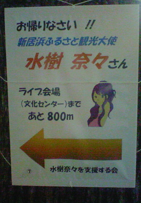 取った市内の小学生以下の子供たちの手形や足形のタイルが貼られていて。 その中に奈々様や美香ちゃんのがないか軽く真剣に探しましたwww 見つかりませんでしたがw 会場の隣の中央公園には屋台が出ていて、そこに行ってみるとどこからともなく 奈々様の曲が。 一番会場に近い場所にあったジュースを売ってた屋台の前にCDラジカセがあり、 どうやらそれで流しているようで、その近くへ。 しかしだ。 流している曲が Romantic Heart ってwwwwwwwwwwwwwwww なぜキャラソンなのかと3人で突っ込まざるを得なかったwww 次の曲もキャラソンで、それは聞いたことのない曲でした。 その曲が終わって、次は何のキャラソンかと話していたところに ちゃららちゃららちゃららちゃららら~♪ 哀愁を漂わせる前奏がwww すぐに気づいて盛大に噴きましたwwwwwwwwwwwwwwwwwwwww 同時に全員で「えええええええええええwwwwwwwwwwwww」っていうw 流れてきたのはまさかの「つがざくら」 新居浜始まりすぎクソワロタwwwwwwwwwwwwww ここの屋台自重しろよマジでwwwwwwwwwwwwwwwwwwwwwwwwww その後流れたのが、深愛、天空のカナリア、夢幻、Blue Moon、エタブレ、 PHANTOM MINDS、だったかな。 順番は微妙に曖昧ですが。 PHANTOMが流れてしばらくしたころに入場が始まったので入場列へと移動。 この時点で開場時間から15分以上遅れてたというw 会場の前に行くと、昼間にはなかった紅白出場おめでとうの横断幕が。 すかさず写メを撮りましたw しかし泉川出身とかそれ大丈夫かwwwwwwwwwww 撮影後、入場列最後尾へ。 入場列の流れは悪くなく、割とスムーズに中へ。 中に入って右手を見ると、フラワースタンドが見えたのでそっちに。 フラワースタンドの送り主は、エレメンツガーデンやアニブロの高橋社長らいつもの方々に加え、個人ファンサイト等々。 中でもすごかったのが 中国水樹奈々ファン一同 台湾・香港水樹奈々ファン一同 マレーシア・シンガポール水樹奈々ファン一同 中国、台湾・香港はまだしも、マレーシア・シンガポールには驚いた。 実際、物販で俺らの後ろに並んでた人(NAN NET Diaryに映ってる黄色の ジャケットを着た人)は中国から来たって言ってたし。 東アジアはおろか、東南アジアにもファンがいるという奈々様の知名度に 改めて驚くと同時に、新居浜公演を狙ってフラワースタンドを送った各地の人たちに 尊敬の念を覚えた。 シンガポールや香港、中国はともかく、マレーシアは日本と物価が違い過ぎるから、 いくら合同といってもかなりの負担になるはず。 それを考えると俺はまだまだだなぁと思いました。 思うことも大事ですが、もっとそれを形にしていきたいと強く思った瞬間。 名古屋でフラワースタンド送ろうかなと本気で考えた。やりたい。 それからホール内へ入って自分の席へ。 スピーカーの真ん前で耳が心配。 でも、ステージまでの距離がががががががががががががg 近いなんてレベルじゃねぇ…この近さはNANA FES以来だ。 両隣の人にも挨拶して、全力で暴れるんで当たったらごめんなさいと一言。 そしていつもの儀式をして準備を整え、隣の人と話しつつその時を待つ。 やがてBGMが止み、いざ開演!! 中身についてネタバレのない程度に少し。 福岡からの曲の変更は5曲目と19曲目。 ともに福岡より激しい曲になっていてさらに死ねるセトリにwww 福岡と比較してUOの使用率は低かった。 特に、あの曲は素晴らしいことになっていた。 個人的にはもうちょっとUO率下がってほしいんやけどなぁ・・・。 そして福岡同様アンコール最後の曲ですべての体力を持っていかれるwww 奈々様がステージの下手に来るたび、「奈々ちゃーーーーん!!!」と叫んで 手を振って、飛ぶとこは全力で飛んで。 飛びつつ前の人の頭の上から奈々ももガン見余裕ですwwwwwwwwwwwww いつもながら太くなく細くなく、すらっとしていて程よく筋肉がついてそれでいて 柔らかそうな奈々ももはやはり最強。 スカート衣装の時に奈々ちゃんが飛んでギリギリ中が見えるか見えないかの 際どいラインが最高すぎましたwww 中にスパッツ穿いてましたけどねwww とりあえず奈々ももを世界遺産に登録しようぜ←←← なお、この新居浜公演はDVD・BD化するとのこと。 みっしーさすがすぎるwwwwwwwwwwwwwwwwwwwwww 当然三嶋コールも起こりましたよっとw で、ここからが俺が新居浜を伝説のライブと称した理由。 これに関しては新居浜だけのことと思うので、ネタバレさせてもらいます。 見たくない人もいると思うので、白字にします。 見たい人は反転させてください。 -----------------------------以下ネタバレ--------------------------------- アンコール後、会場内が暗転し、全員で「もう一回」コール。 その声に応え三度ステージに現れた奈々様は、小脇に何かを抱えての登場。 ステージ中央に来て、それを掲げ、話を始める。 こリハーサル前にこの場所、新居浜市市民文化センターにおいて行われた 観光大使の委嘱式の話。 小脇に抱えていたものは、その時に市長から手渡された依嘱状。 外側をガラス